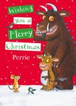 This whimsical Christmas card features an illustration of The Gruffalo and The Gruffalo's child, accompanied by a little mouse, against a red snowy background. The message “Wishing you a Merry Christmas, Perrie.” is displayed in a playful, handwritten font, creating a festive and charming atmosphere for a personalised holiday greeting.