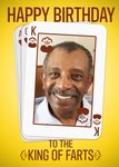 Illustration of Pack Of Cards With King Of Hearts Photo Upload Card On Top. Text reads: "Happy Birthday To The King Of Hearts"