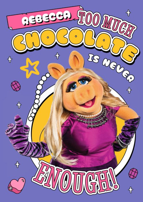Featuring an image of Miss Piggy in a shiny purple dress and long gloves surrounded by hearts, stars, diamonds & bead doodle illustrations, with bold typography above & below, all on a purple coloured background.