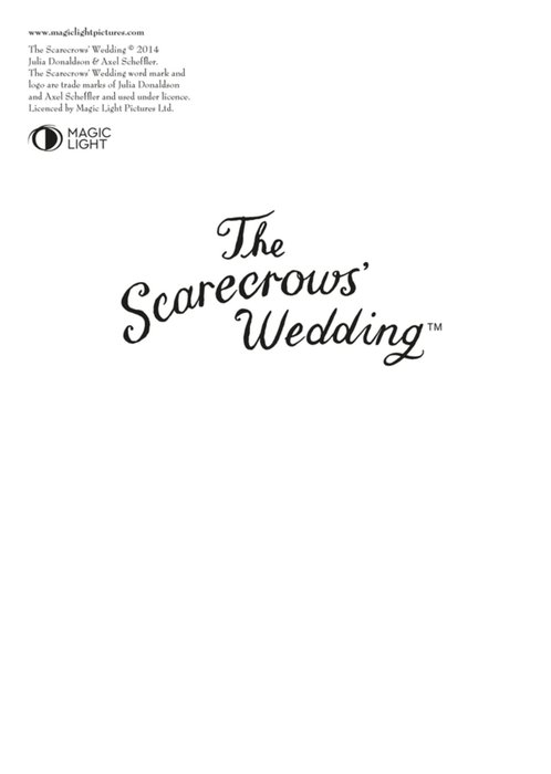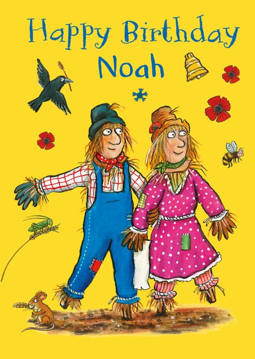 Featuring an illustration of two scarecrows, with flowers, a mouse, grasshopper, bird and a bee on a yellow background.