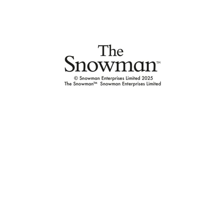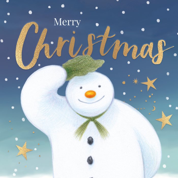 Featuring an illustration of The Snowman on a snowy gradient background of deep blue and white, surrounded by golden stars. The snowman is smiling and tipping his green hat beneath the gold foil-style text.