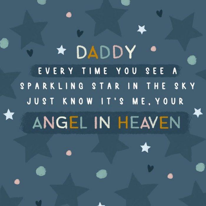 Front of card: Thinking Of You Father's Day Card Colourful typography on a star pattern background. Text reads: "Daddy every time you see a sparkling star in the sky just know it's me, your angel in heaven".