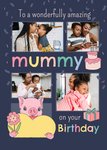Front of card: Featuring an illustration of Moonpig holding a heart with four photo frames on a blue background. Text reads: "To a wonderfully amazing mummy on your birthday".