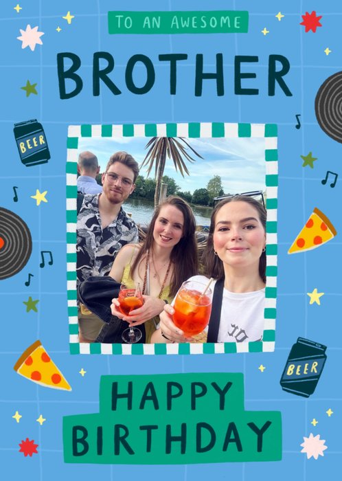Featuring a hand-drawn photo frame in the centre surrounded by bold text, stars, pizza slices, beer cans, musical notes and vinyl records on a bright blue background.