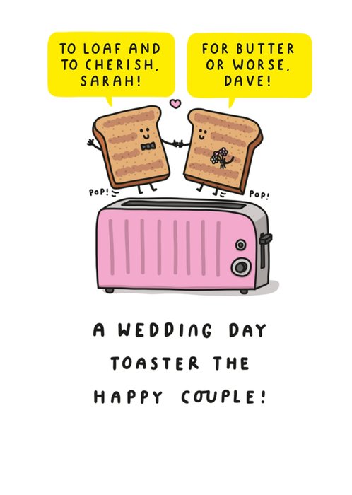 "To loaf and to cherish, Sarah! For butter or worse, Dave! A wedding day toaster the married couple!". 'Sarah!' and 'Dave!' can be personalised!