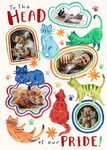 A colourful and cat-filled greeting card with a cream background features six lively photo frames surrounded by playful illustrated felines, paw prints, and bright doodles, with bold text celebrating the “head of our pride.”