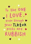 This lighthearted and humorous greeting card features bold, colourful text that reads, “To the one I love, even though your TikTok posts are rubbish,” on a bright yellow background, decorated with small red, white, and black hearts.