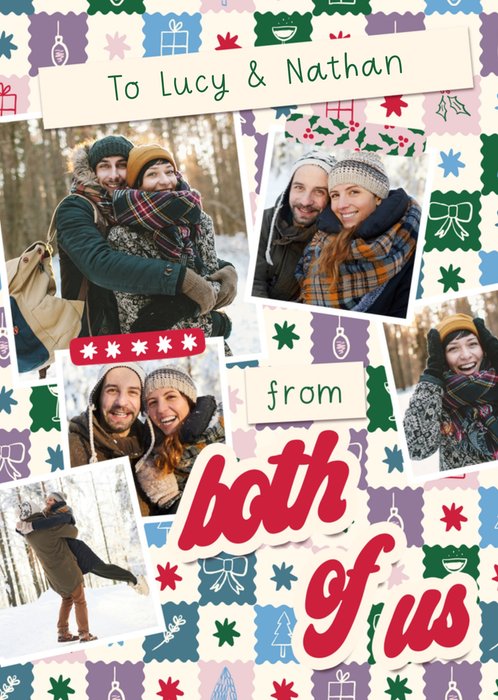 A greeting card with five rectangular photo areas—three across the top, one centre left and one bottom left—on a cream background patterned with colourful festive icons in red, green, blue and purple.
