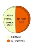 There is a pie chart with the half of the chart for Birthday Cake, reading no shortage. The other half is Crisps, Petrol and Common Sense, reading shortage.