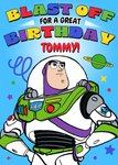 This Toy Story greeting card features a bold illustration of Buzz Lightyear standing proudly beneath colourful block lettering, with a personalised name and a bright blue background dotted with stars and planets.