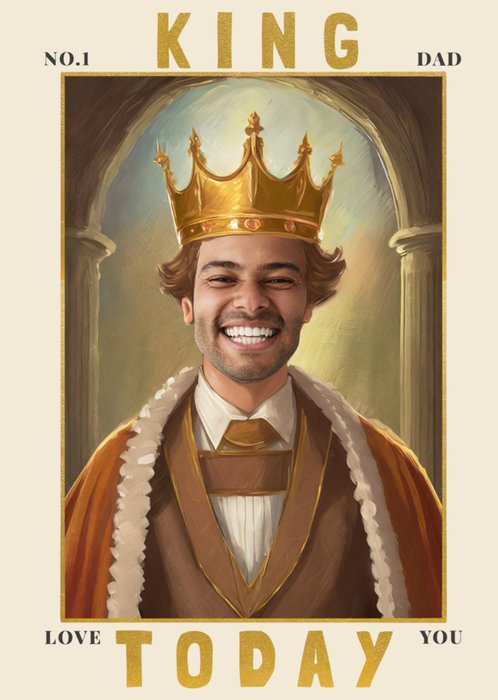 Front of card: Featuring an AI generated illustration of a king in the layout of a king playing card with a photo frame for uploading your own face. Text reads: "No.1 Dad. King today. Love you."