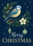 Featuring a blue tit perched among holly, berries and winter foliage with hanging baubles on a deep blue coloured background.