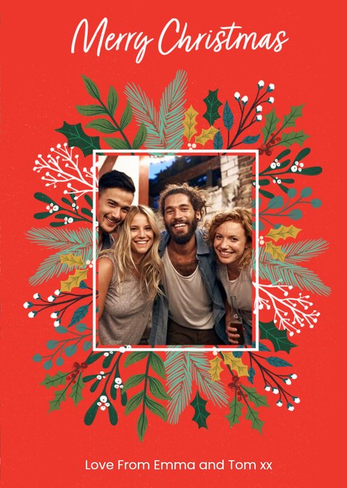 Front of card: Traditional Illustrated Foliage Photo Upload Christmas Card Illustrated Foliage with a large Editable Photo Upload in the middle. Text reads: "Merry Christmas Love from Emma and Tom xx this is editable
