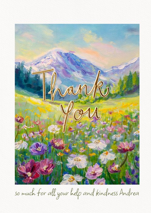 Featuring a landscape scene of a meadow of flowers with a mountain in the background, in an oil painting style, with text in a gold foil effect.