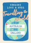 "Sending love & hugs travelling the world from Australia to England". ' Australia' and 'England' can be personalised!