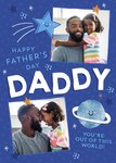 Front of card: Father's Day Photo Upload Card Two photo frames with stars and planets. Text reads: "Happy Father's Day Daddy you're out of this world!". 'You're out of this world!' can be personalised!