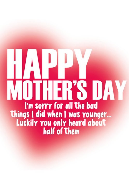 Front of card: Large typographic card with white text on a blurred heart. Text reads: "happy mothers day, im sorry for all the bad things i did when i was younger...luckily you only heard about half of them".