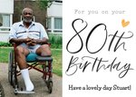 Front of Card: Black calligraphy on white background and gold heart with photo upload on the left. Text reads: For you on your 80th Birthday. Have a lovely day Stuart! With customisable name and photo upload options