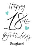 Front of Card: Black calligraphy on white background surrounded by turquoise hearts. Text reads: Happy 18th Birthday Daughter! With customisable text options