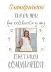 Text reads: 'Grandparents' -this can be personalised! Thank you for celebrating my first Holy Communion. There is a photo upload box in the middle of the text with illustrations of crosses and leaves on either side.