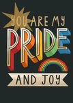 A stylish and heartfelt card featuring bold retro typography and a rainbow motif on a dark background. The colourful 3D-effect lettering spells out a loving message perfect for expressing pride and affection, especially during Pride month. Gold foil and glitter-style effects enhance the celebratory tone.
