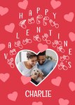 Front of card: Features Typography with sign language symbols on a red background and a heart shaped photo upload. Text reads: "Happy Valentine's Charlie". Charlie can be customised.