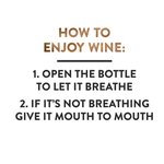 Text reads: "How to enjoy wine: 1. Open the bottle to let breathe. 2. If it's not breathing give it mouth to mouth".