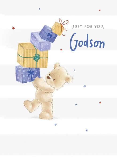 Front of Card: Illustration of a teddy carrying birthday gifts on grey and white stripy background with stars and text Text reads: "Just for you, Godson"