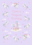 Front of card: Featuring pink script effect typography with a castle illustration below, surrounded by 10 unicorns, all on a purple background with rainbows, stars & clouds.