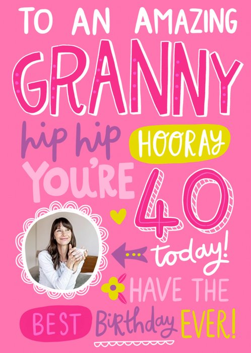 Front of card: Amazing Granny's 40th Birthday Photo Upload Card Various fun typography on a pink background. Text reads: "To an amazing Granny hip hip hooray you're 40 today! Have the best birthday ever!".