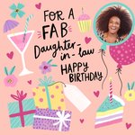 Front of card: Daughter-In-law's Photo Upload Birthday Card Various spot Illustrations including presents and cake. Text reads: "For a fab daughter-in-law Happy Birthday".