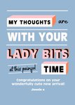 Front of card: Humorous New Baby Congratulations Card Various typography on a blue background. Text reads: "My thoughts are with your lady bits at this painful time congratulations on your wonderful cute new arrival! Jennie x". 'Jennie x' can be personalised!