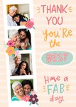 Front of card: Thank You Photo Upload Card Vertical photo frames surrounded by flowers with colourful typography on a striped background. Text reads: "Thank you you're the best have a fab day".