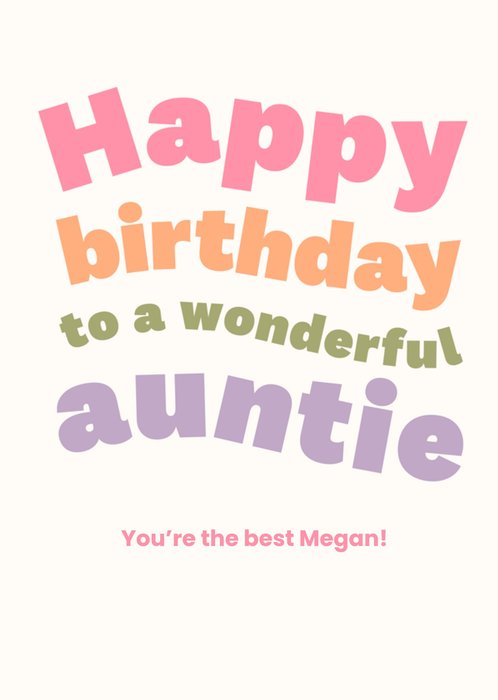 Front of card: Featuring bold & colourful wave effect text on a cream background. Text reads: "Happy birthday to a wonderful auntie, You're the best Megan!" "You're the best Megan!" is editable.