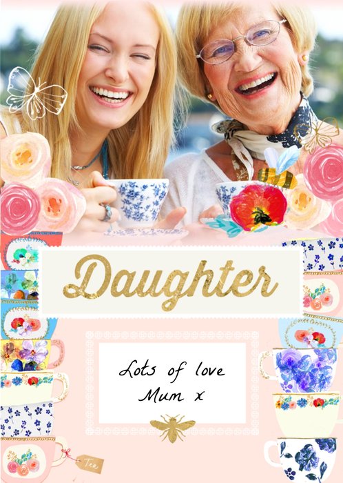 Vintage Tea Cups Personalised Photo Upload Birthday Card For Daughter