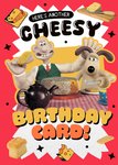 Front of card: A fun and pun-filled Wallace & Gromit birthday card featuring the iconic duo enjoying cheese and tea. The background is scattered with cheese wedges and stars, with a playful caption.