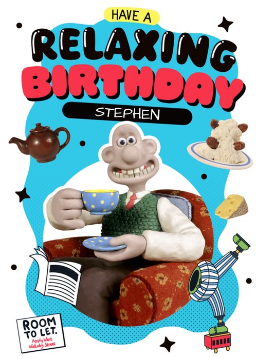 A charming and light-hearted Wallace & Gromit birthday card featuring Wallace sitting in a cosy red armchair, enjoying a cup of tea. He is surrounded by fun elements like cheese, a teapot, sausage and mash, and the wrong trousers. The name is editable.