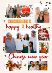Front of Card: A traditional and caring Chinese New Year Photo Upload card featuring five photo upload areas in a collage-style layout. There are images of a Sun Loong (imperial parade dragon) and a Maneki-neko (lucky/fortune cat).