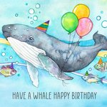 Watercolour illustration of whale in party hat with balloons and underwater background.