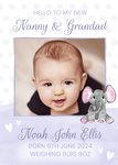 Front of card: To My Nanny and Grandad New Baby Photo Upload Card Beautiful illustration of an elephant on a soft watercolour background with hearts and polka dots. Text reads: "Hello to my new Nanny & Grandad" and "Noah John Ellis born 6th june 2021 weighing 6lbs 8oz". 'Nanny & Grandad', 'Noah John Ellis' and ' born 6th june 2021 weighing 6lbs 8oz' can be personalised!