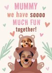 Front of card: Featuring an illustration of two cute bears with face upload photo frames surrounded by colourful hearts. Text reads: "Mummy we have so much fun together". 'Mummy' can be personalised!