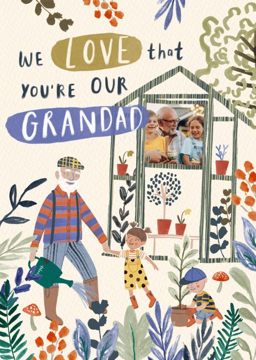 A heartfelt and charming illustrated card showing a cheerful grandad gardening with his grandchildren in a colourful, leafy greenhouse scene. The soft, textured background and hand-drawn foliage add warmth, with a photo upload frame that makes it perfect for a personal touch.