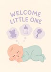 Illustration of a sleeping baby in a mint green sleepsuit with thought bubbles above showing a teddy bear, baby bottle, and rattle, with pastel purple text reading “Welcome Little One.”