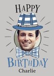 Front of card: A cheery photo upload birthday card featuring a sketchy, hand-drawn illustration of a patterned Trilby/Fedora hat and bow tie above and below photo upload area. There is 1 photo upload area.