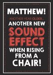 "Matthew! Another year older... another new sound effect when rising from a chair!"
