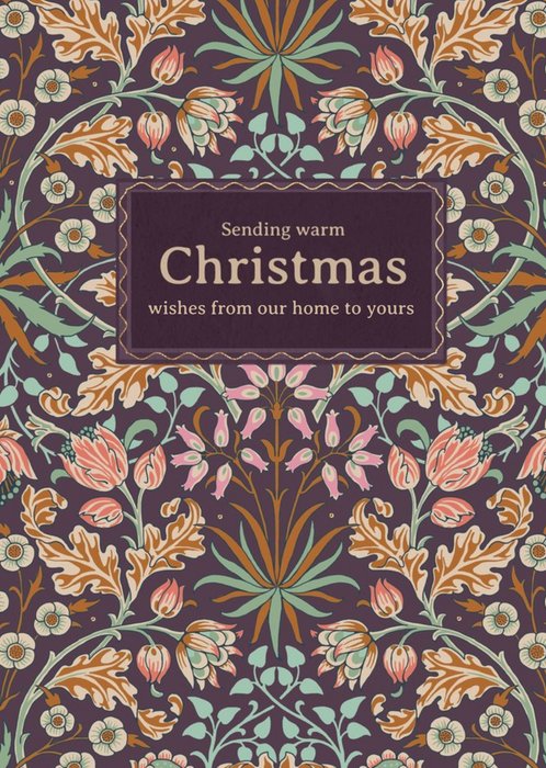 Featuring a William Morris floral pattern of a detailed ornate symmetrical design on a dark plum coloured background. There is text on a central panel.