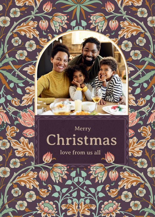 Featuring a single arched photo frame above a central text panel, surrounded by an intricate floral and leaf pattern with berries and decorative motifs, on a dark purple background.