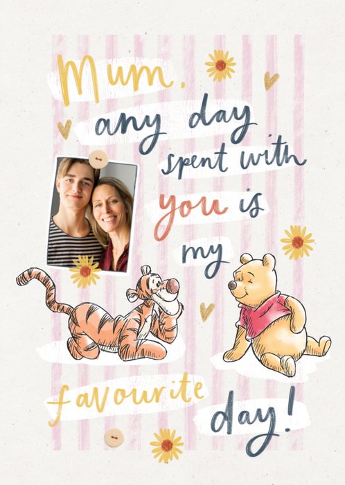This Winnie the Pooh-themed greeting card design features a sweet message from an unborn baby, a heartwarming photo upload area shaped like a rectangle with rounded corners, and illustrations of Pooh and Eeyore on a soft, confetti-style background.