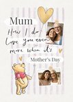 A sweet and sentimental Mother's Day card featuring a textured background with soft colours, and it's adorned with a heartfelt message in script lettering. The card is embellished with a golden heart balloon and scattered heart illustrations, symbolizing love and affection. Adding a touch of nostalgia and warmth is an illustration of Winnie the Pooh holding a heart-shaped balloon by a string. There are two photo upload areas inside sketched frames being helped up by buttons. This card seems to capture the essence of Mother's Day, expressing deep appreciation and love for a mother in a way that's both elegant and tender.