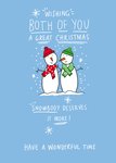 Front of card: Featuring two illustrated snowmen wearing woolly hats and striped scarves with falling snow and star doodles, on a light blue background.